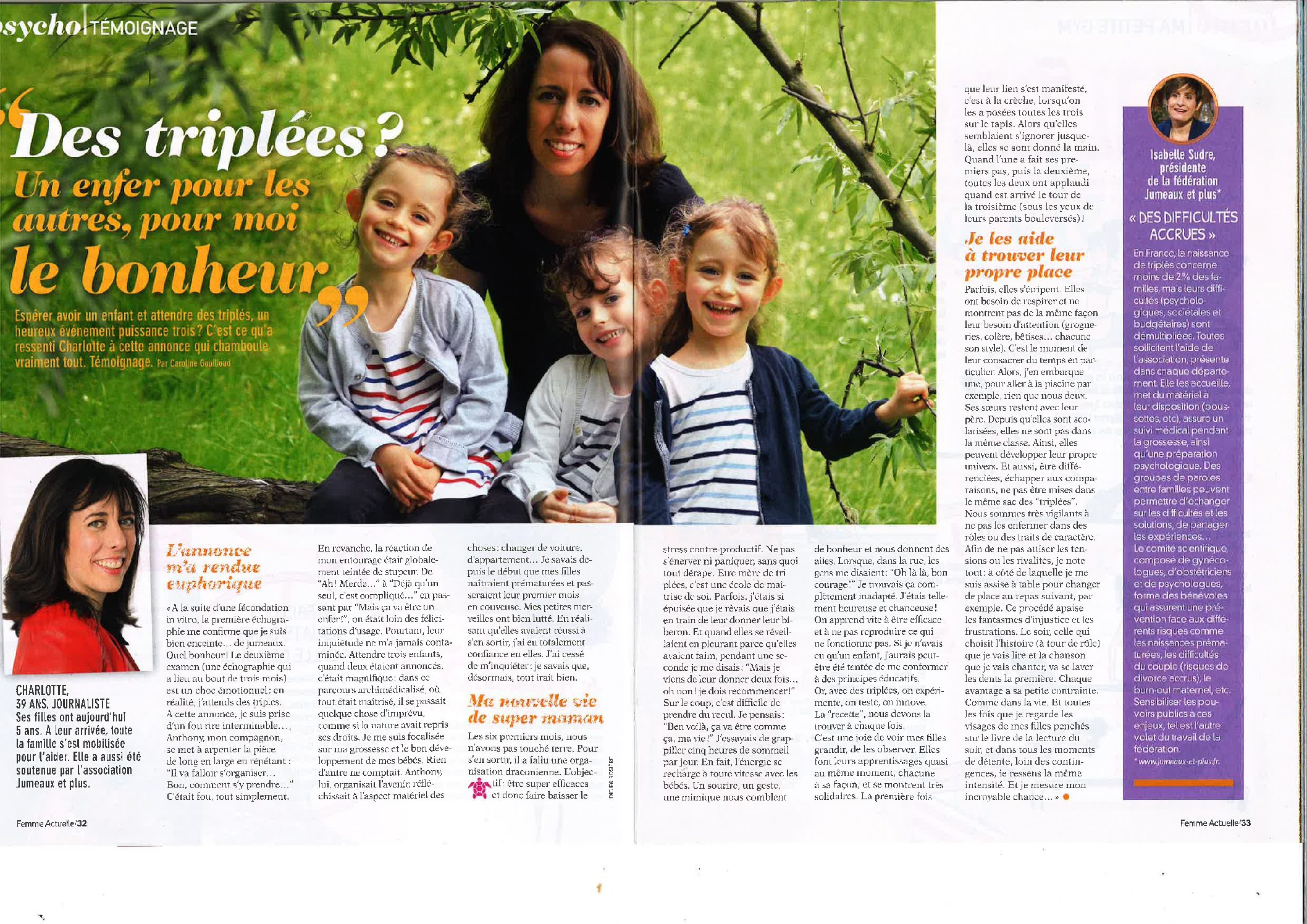 A lire : Beau témoignage de Charlotte, maman de triplées et adhérente de Jumeaux et plus Paris ,dans la magazine Femme Actuelle.